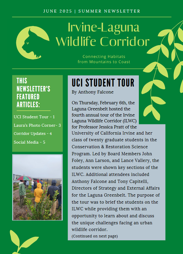 On Thursday, February 6th, the Laguna Greenbelt hosted a tour of the Irvine-Laguna Wildlife Corridor in Irvine, CA. Led by Board Members John Foley, Ann Larson, and Lance Vallery, Professor Jessica Pratt of the University of California Irvine and her class of twenty graduate students were shown key sections of the Corridor. Additional attendees included Anthony Falcone and Tony Capitelli, Director of Strategy and External Affairs andxxxx respectively, for the Laguna Greenbelt. The purpose of the tour was to brief the students on the Corridor while providing them with an opportunity to learn about and discuss the unique challenges facing an urban wildlife corridor.